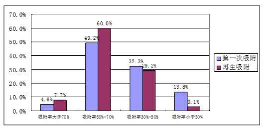 抽檢報告顯示,第一次試驗后35批次樣品的甲醛吸附效率大于50%,可認(rèn)定為吸附效率較高;而經(jīng)過再生后,較高吸附率產(chǎn)品占67.7%,數(shù)量明顯增加。宋紅波工程師表示,這表明暴曬可以使使用過的活性炭達(dá)到再生的目的。